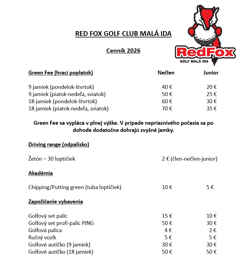 Cenník - Golf Malá Ida - Red Fox Golf Club